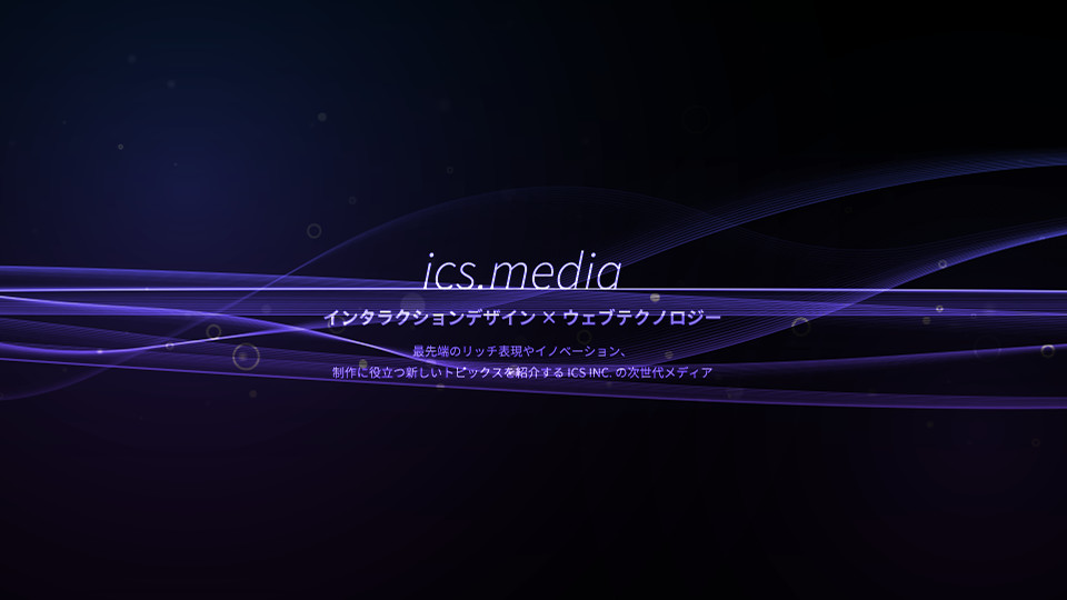 ICS MEDIAのトップページに掲載しているモーショングラフィック。これはCSSとHTML Canvas要素を使って作成したものです。時間経過とともに波の形状と色彩が変化し、多彩な表現を楽しめるようになっています。