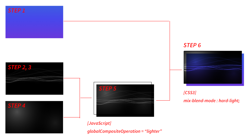 ステップ3とステップ4で作成した表現を合成します。輝度(ルミナンス)だけで合成したいので、canvas要素のglobalCompositeOperationプロパティをlighterに設定してdrawImage()メソッドで合成します(ステップ5のコード)。