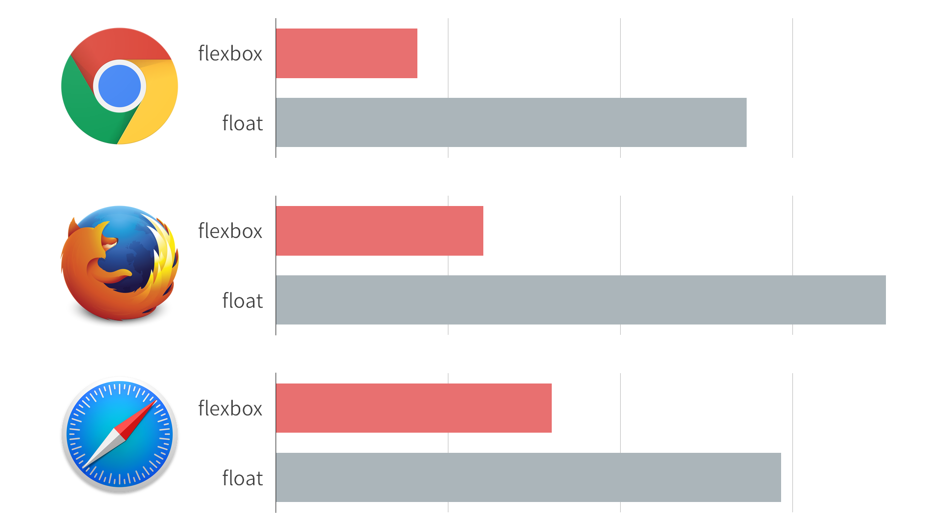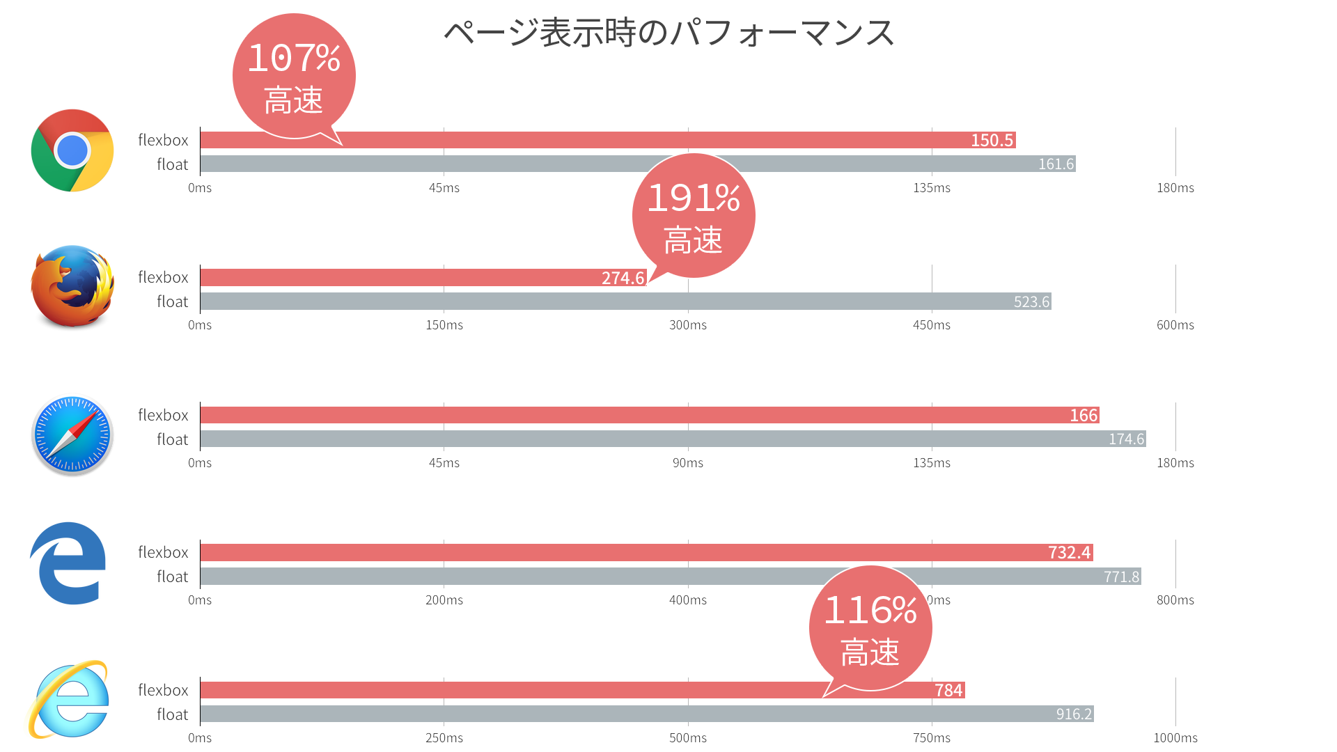 各ブラウザーで10回検証し、処理時間の平均値をグラフ化したのが下図です。短い時間であるほど高速な処理であることを示します。FirefoxではFlexboxが275%高速で、他のブラウザーについてはFlexboxの方がやや早い結果となりました。