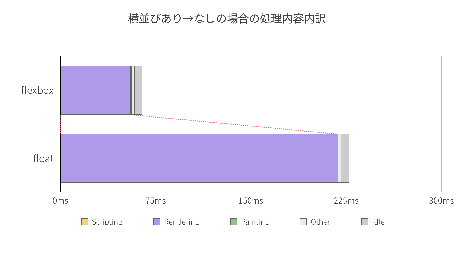 横並びの切替時にFlexboxとfloatでパフォーマンスの差が大きく出ましたが、その差は何なのでしょうか? Google Chromeのデベロッパーツールを用いて各処理の所要時間を計測してみたところ、「Rendering」(HTMLの各要素の位置決定処理)の差が一番大きいことがわかりました。