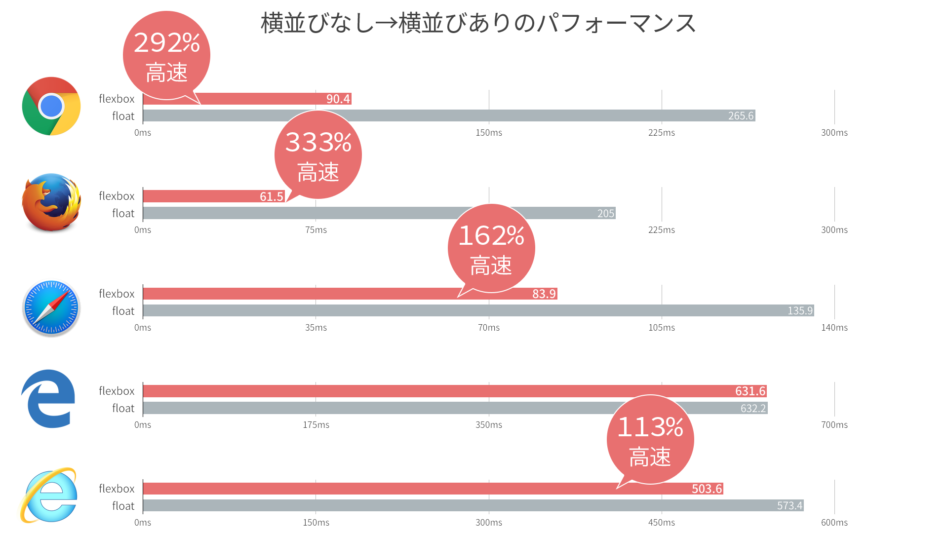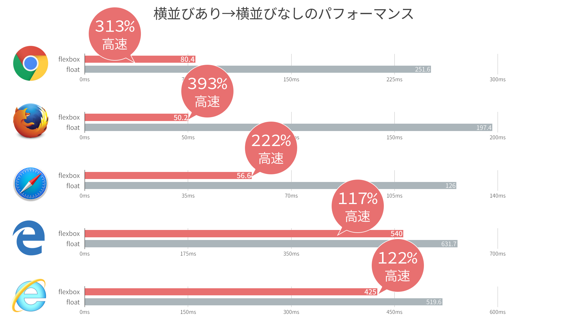| ブラウザ | Flexbox 平均値(ミリ秒) | float 平均値(ミリ秒) | floatに対するFlexboxの速度 |