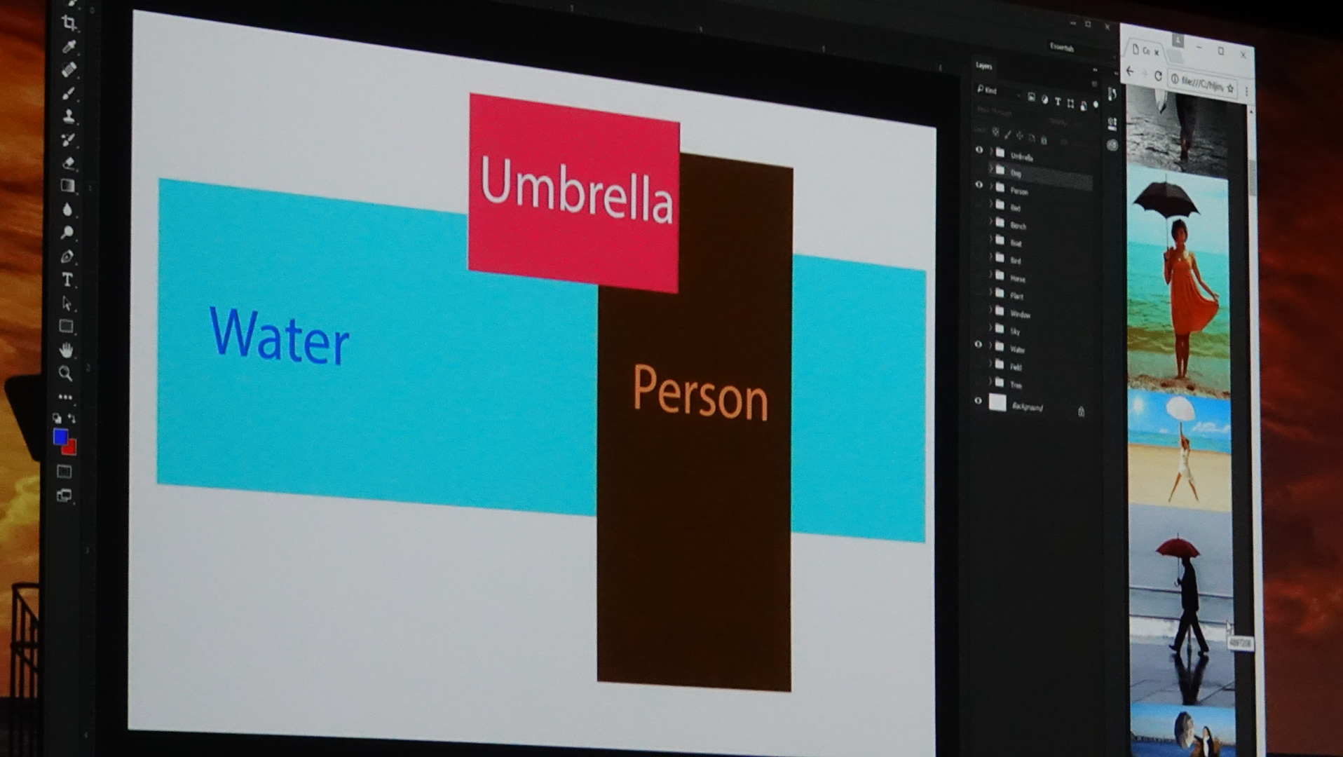 「Water」「Umbrella」「Person」という文字と作成したい構図を長方形でレイアウトすれば、背景に水があり傘を持った人の構図の写真が検索されます。