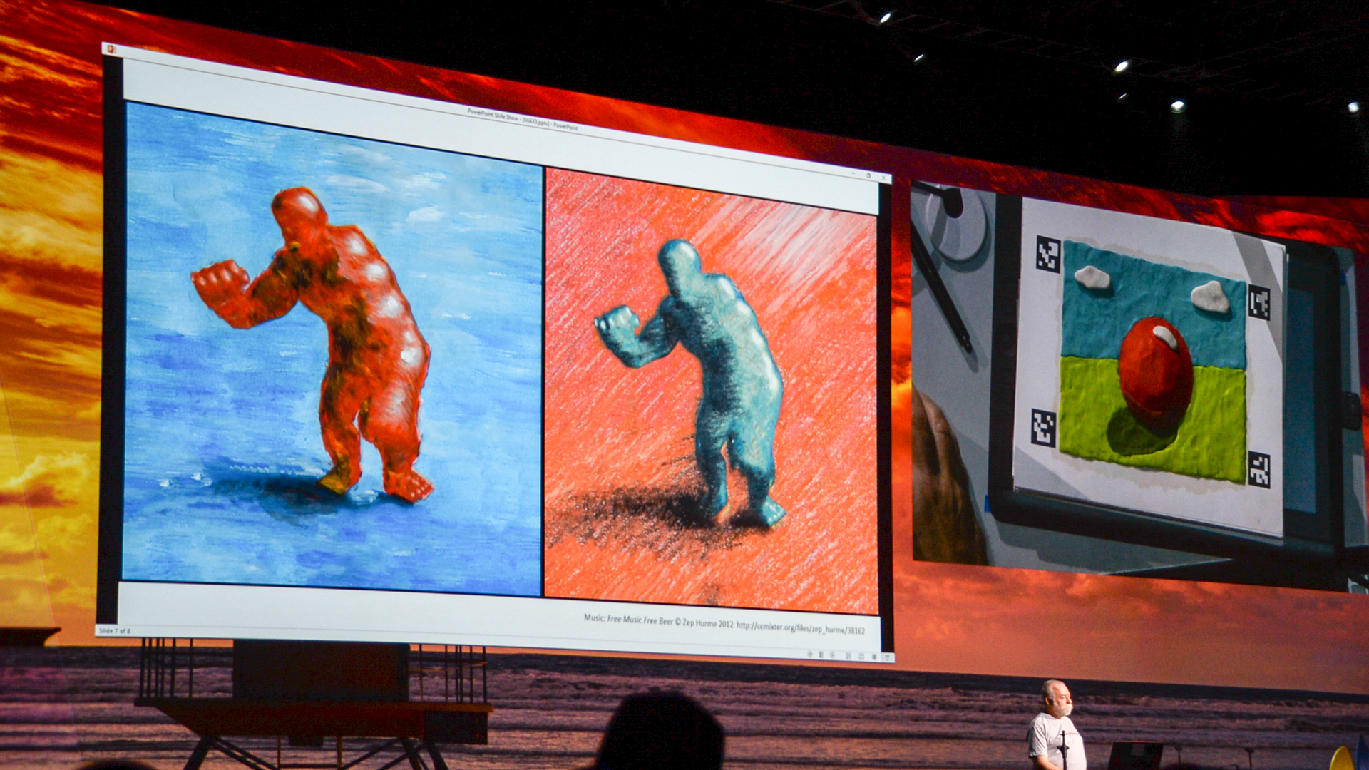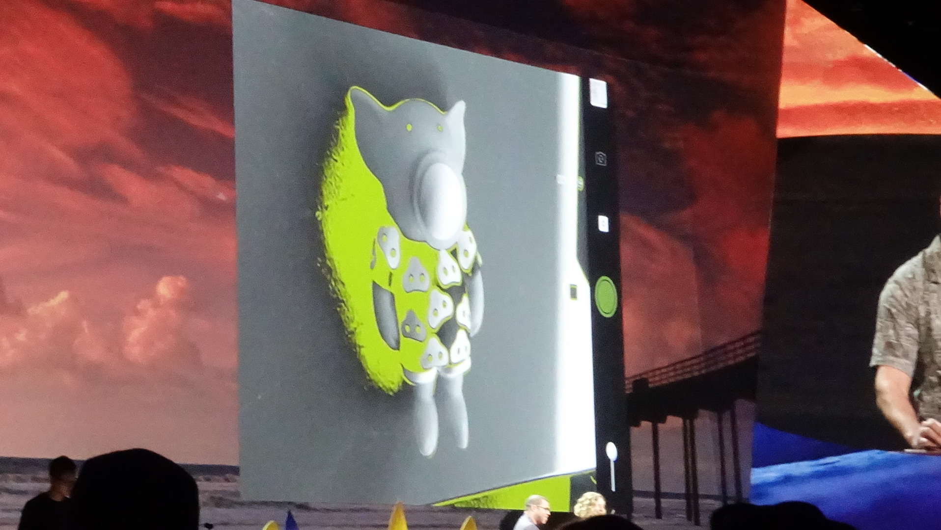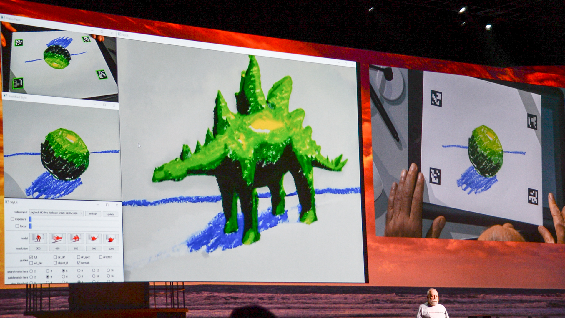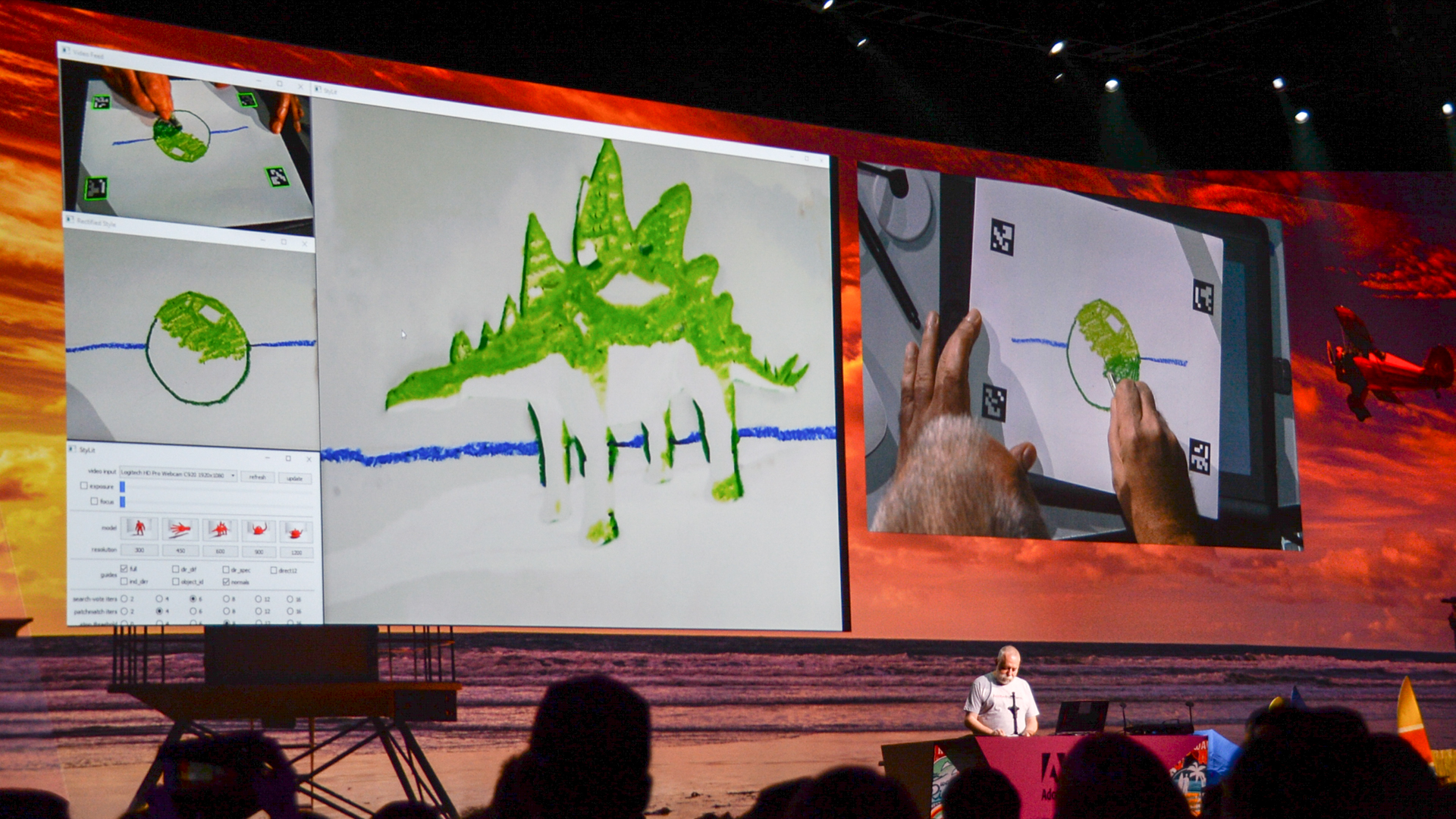 冒頭を飾ったのは未来のペイント技術「Stylitスタイリット」。マーカー付きの紙に塗り絵を描くと、3Dオブジェクトに着色されるというもの。デモでは、紙に円を描くことで、3Dモデルとして用意された恐竜が着色されていきました。