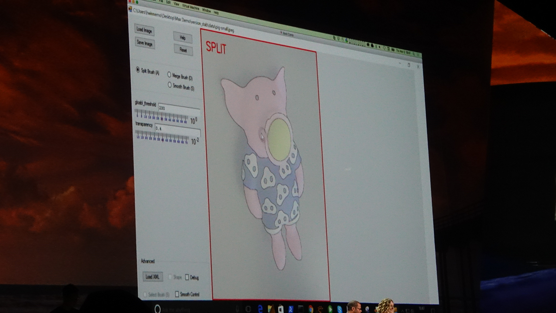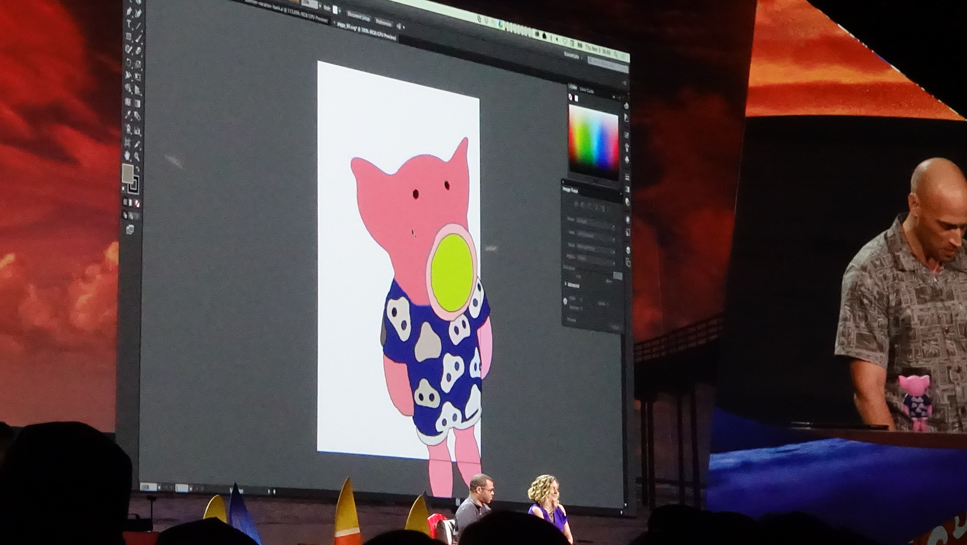 撮影した写真を解析しベクタートレースする技術「Inter Vectorインター ベクター」。デモでは、登壇者の豚のぬいぐるみを撮影し、Illustratorに合成するまでの手順を紹介されました。