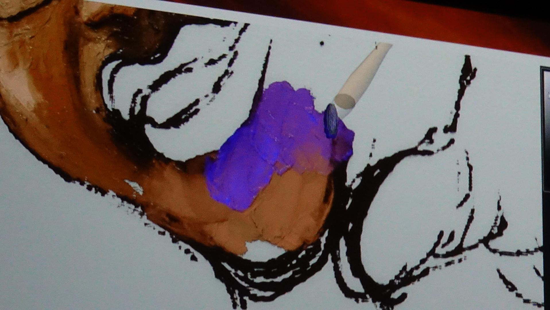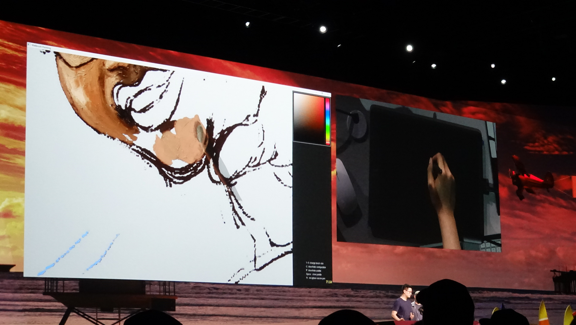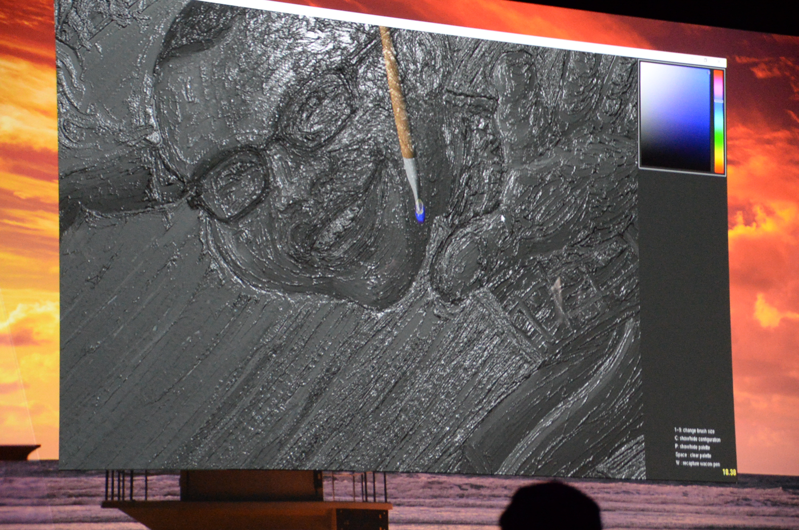 塗りには3Dの情報が保持されているので、光源の位置を変更すると光のあたり具合が変わります。デモでは、作品を3D回転させ、光のあたる位置が変わる様子が実演されました。