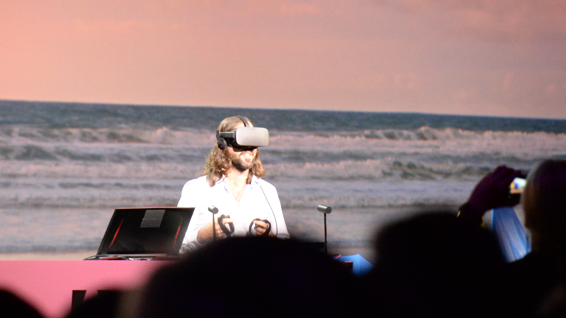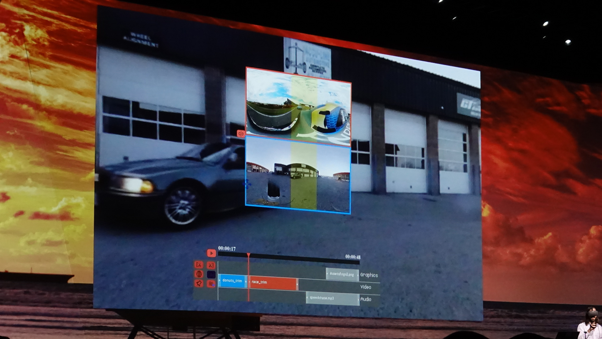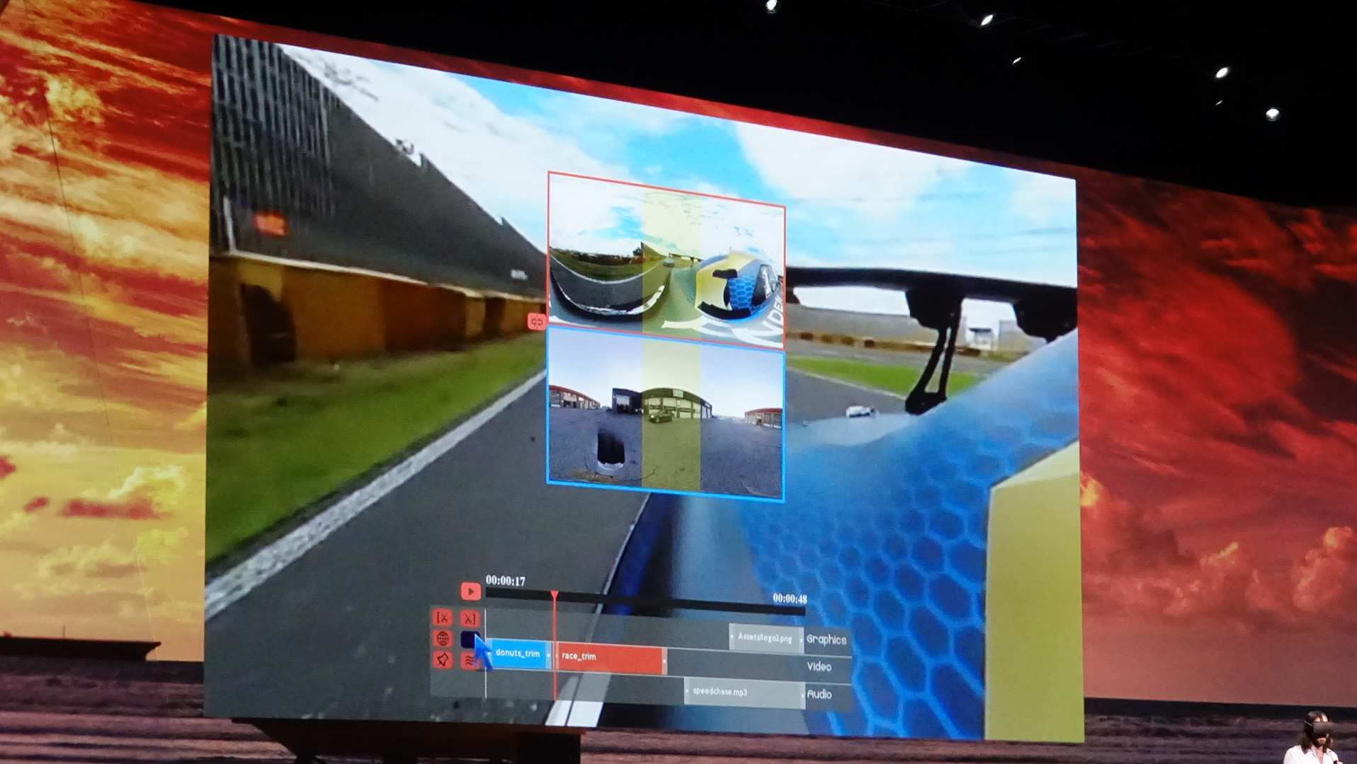 会場では、HMDをつけたまま複数のVR動画を編集する様子を実演。編集と同時に出力結果である360度映像を確認できるので、効率的にVR映像を作成できます。
