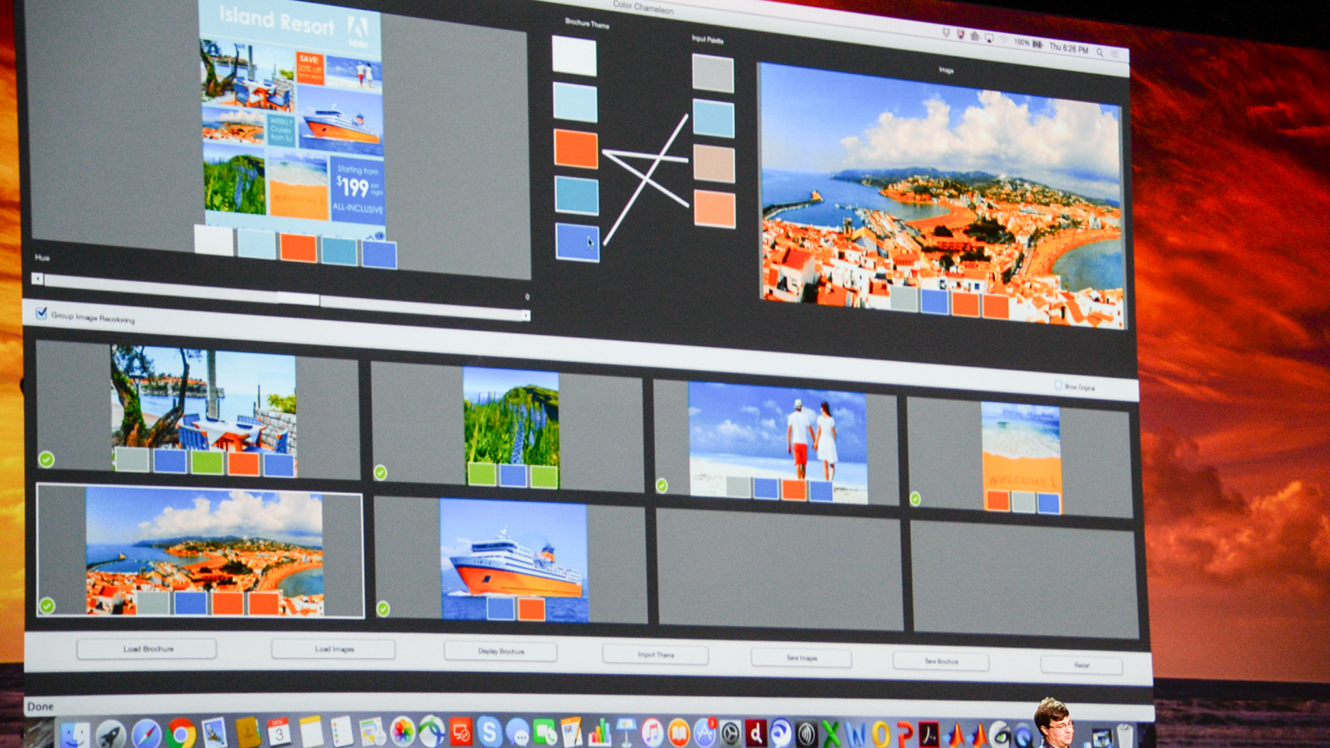 テーマカラーに写真の色調を最適化する技術「Color Chameleonカラー カメレオン」。グラフィックデザインにおいて、従来のワークフローではテーマカラーにあわせPhotoshopで写真を一枚ずつ補正するのは大変な作業でした。この機能をつかえばボタンひとつで、写真の色調をテーマカラーに合わせ、統一感のあるデザインに仕上げられます。