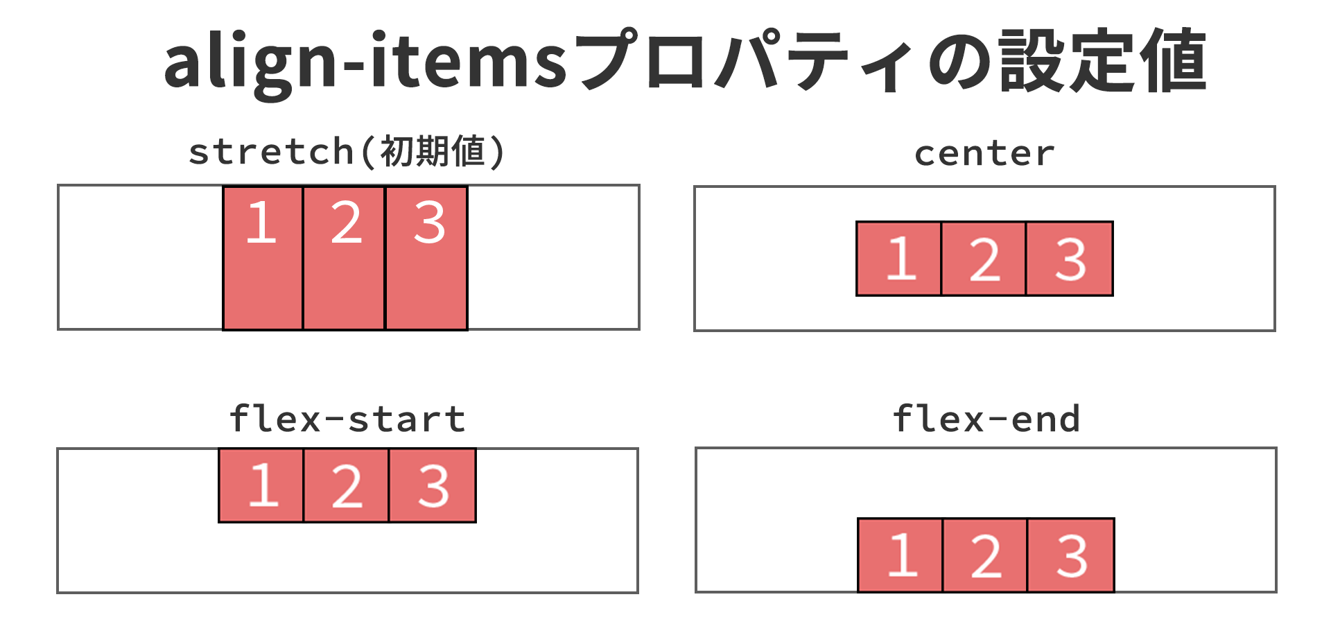 2点目に、Flexboxでは縦方向(正確には垂直軸方向)のレイアウトの為の機能があります。align-itemsプロパティを使うと、縦方向の上寄せ・中央寄せ・下寄せ等ができます。