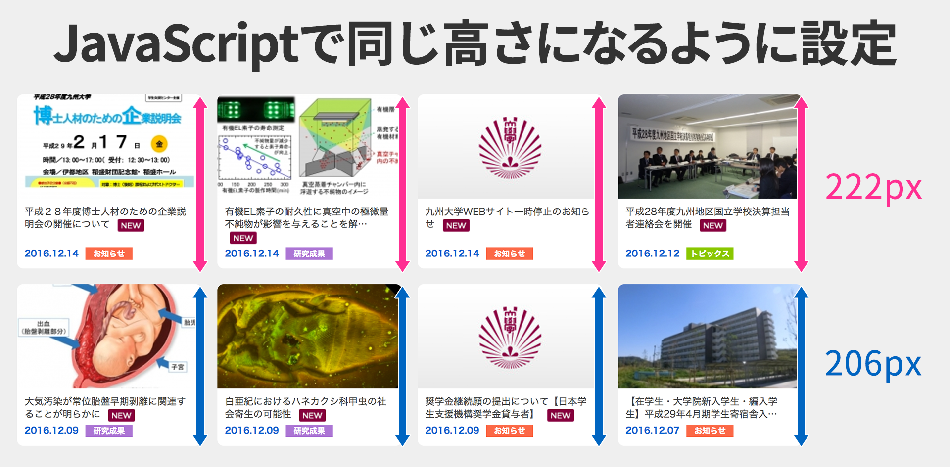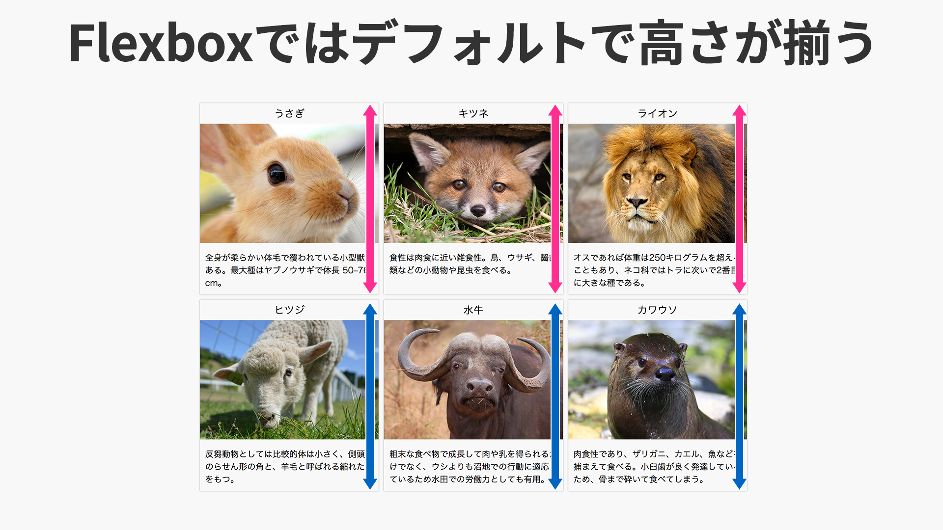 3点目は、横並びした要素の高さが揃わないことです。下図のようなカード型のレイアウトを行いたい場合、JavaScriptを使って高さを強制的に変更する必要があります。