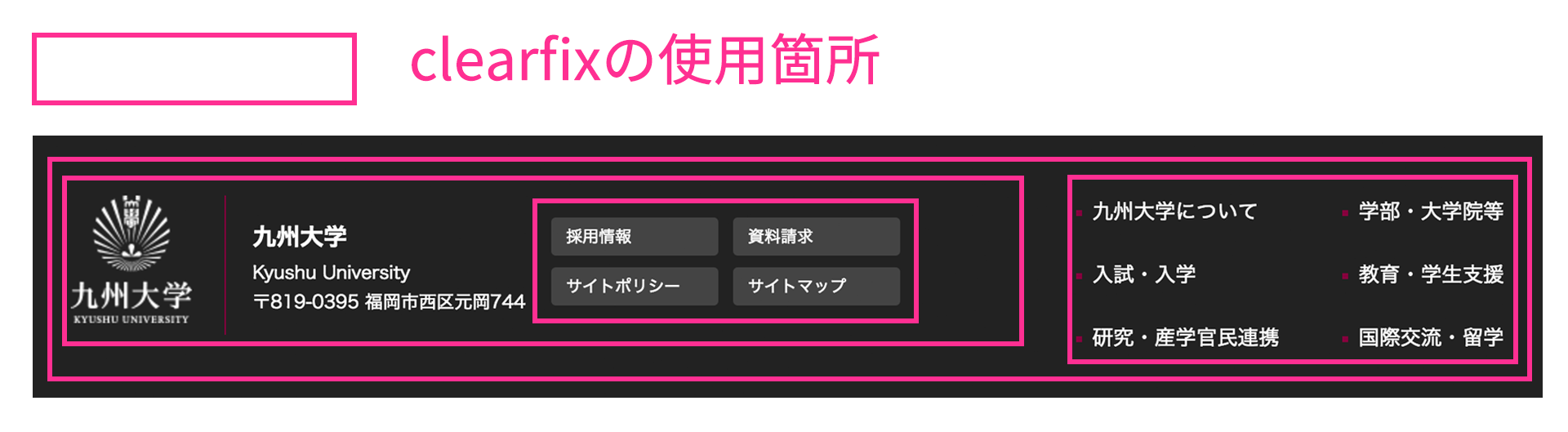 ボックスの横ならびにfloatプロパティは必須でしたが、いくつかのデメリットがあります。九州大学ウェブページのフッター部分を例に、3つ紹介します。