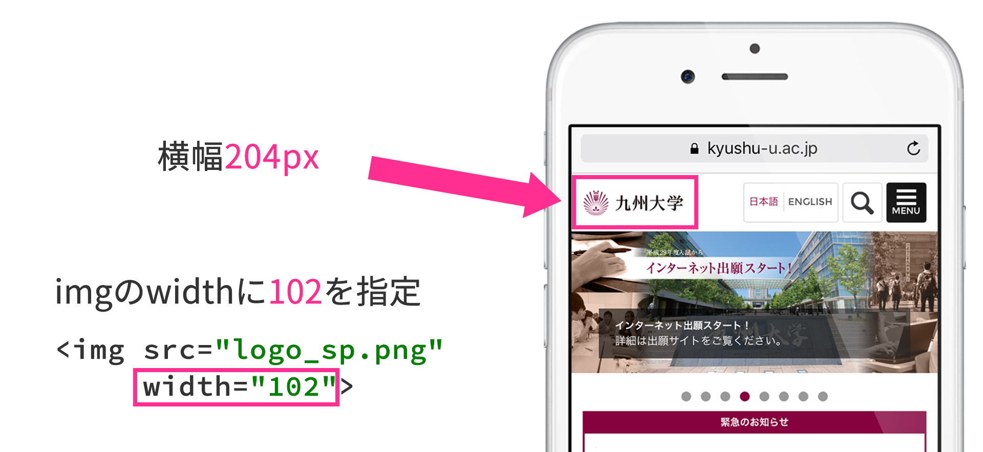 次に示すのは九州大学のウェブページですが、ロゴ部分においてその対応がなされています。