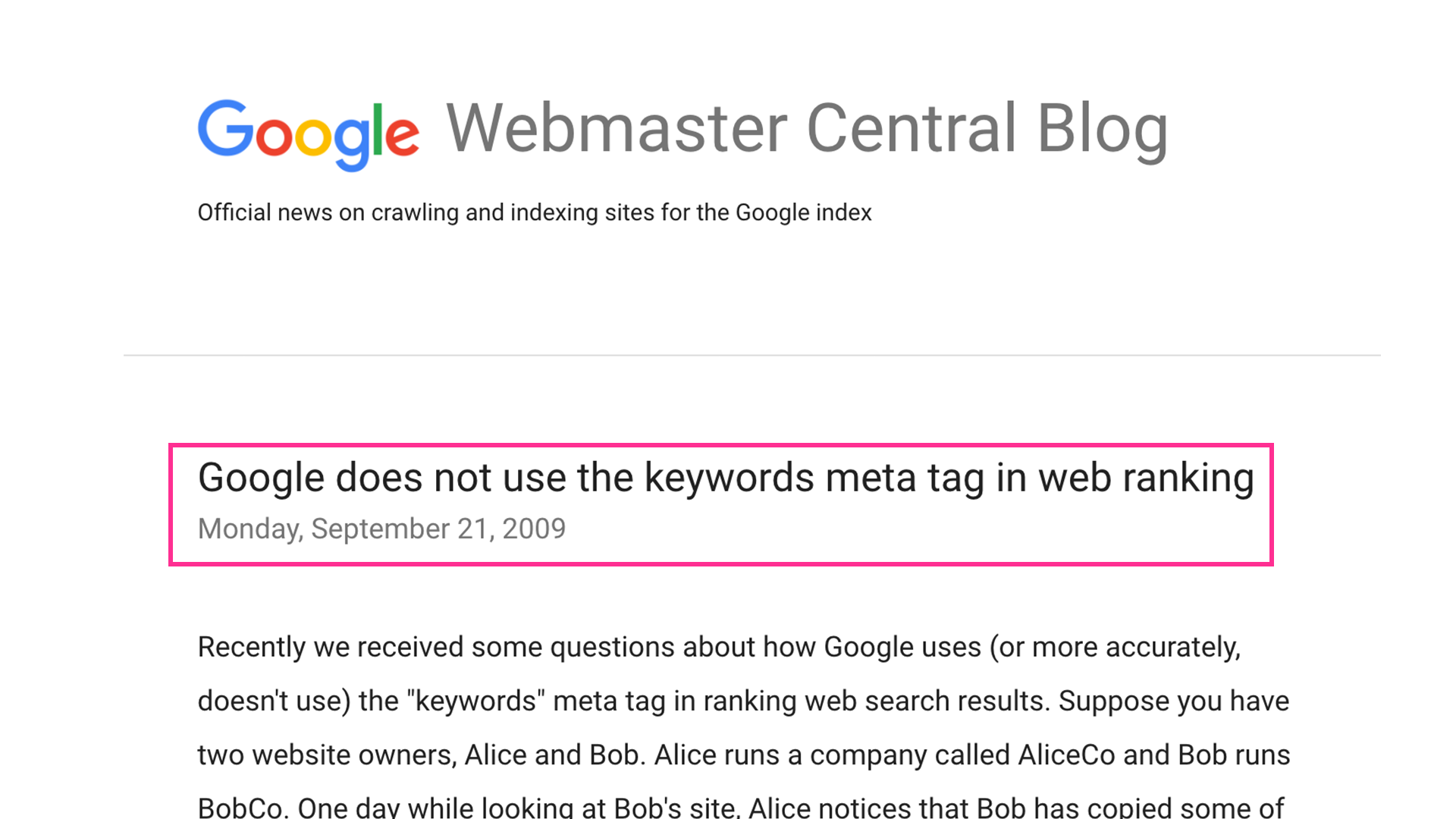 ▲ Googleは公式ブログにてmeta keywordsを検索順位に反映しないと公表した
