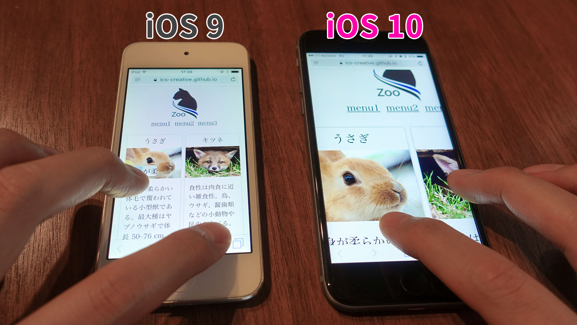 user-scalable=noの指定をしたサンプルページを用いて試してみましょう。次に示すキャプチャーの左側がiOS 9、右側がiOS 10です。user-scalable=noの指定があるにもかかわらず、iOS 10の方はピンチアウトでコンテンツを拡大できることがわかります。