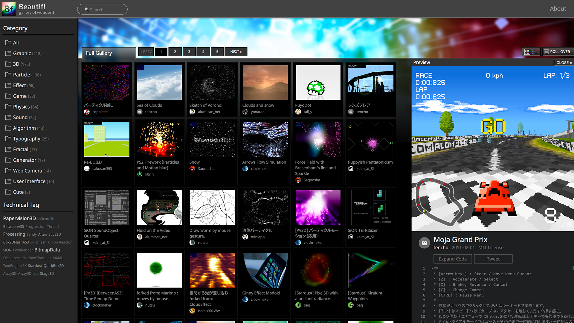 Beautiflはかつて面白法人カヤックが運営していた『wonderfl』に投稿されたFlash作品をピックアップしたギャラリーサイト。画面左側のナビゲーションにshuffle-textを利用しています。このサイトに関することは記事「Flash作品を残すために取り組んだこと」や「脱jQueryのためにしたこと」、「CSS Grid Layoutをガッツリ使った所感」にまとめていますので、あわせてご覧ください。