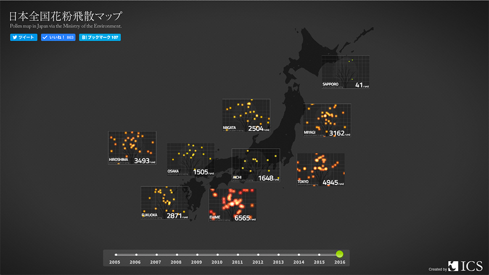 ▲ 日本全国花粉飛散マップ Pollen Map in Japan | ICS