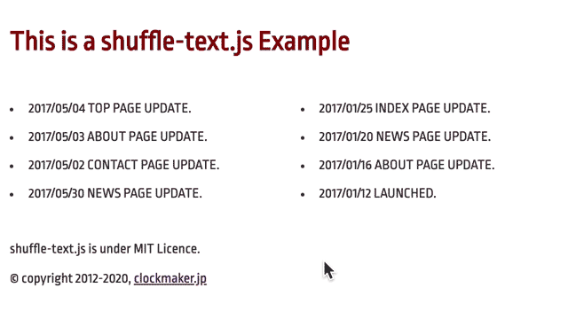 実はこのライブラリは2012年に公開していたものを新しくしたものです(参照「HTML5でテキストのシャッフル演出ができるJSライブラリ「ShuffleText.js」 | ClockMaker Blog」)。TypeScript化したことや、npmで公開した点など、時代の流れに即して更新してあります。ぜひ気軽に利用ください!