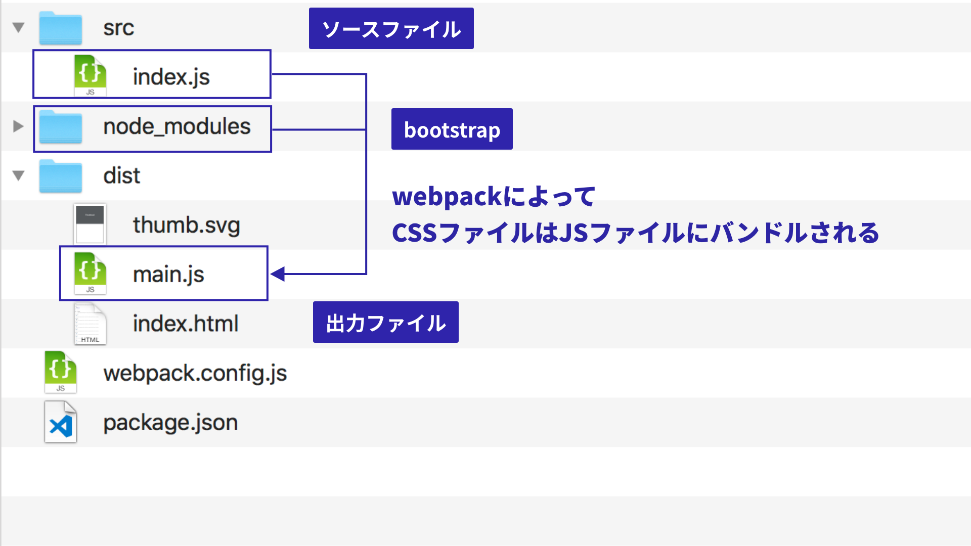 srcフォルダー内にindex.jsファイルを格納します。index.jsファイルにはimport文を用いて、Bootstrapを取り込みます。