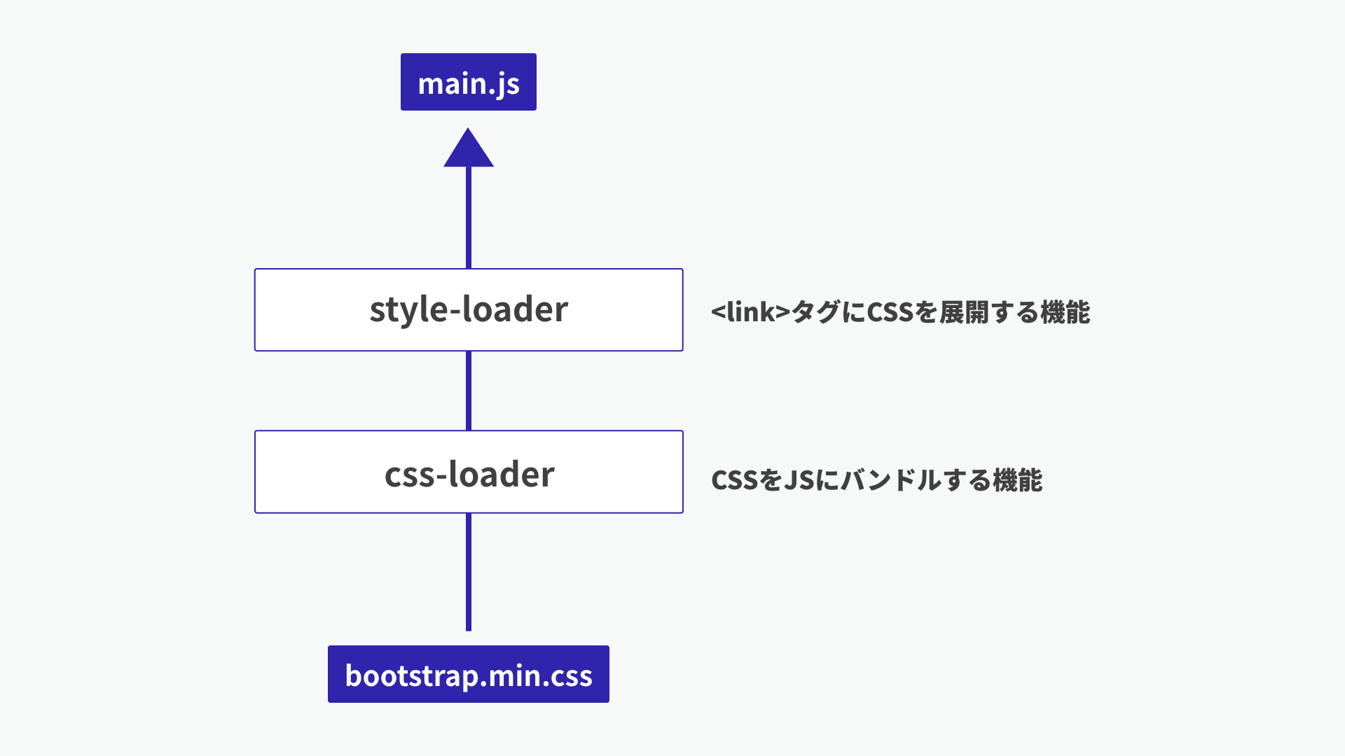 続いて、webpack.config.jsファイルに次の設定を記載します。本来はさまざまなオプションを設定しますが、最低限の内容としてコードを紹介します。CSSのバンドルには「style-loader」と「css-loader」の二種類が必要だと覚えてください。