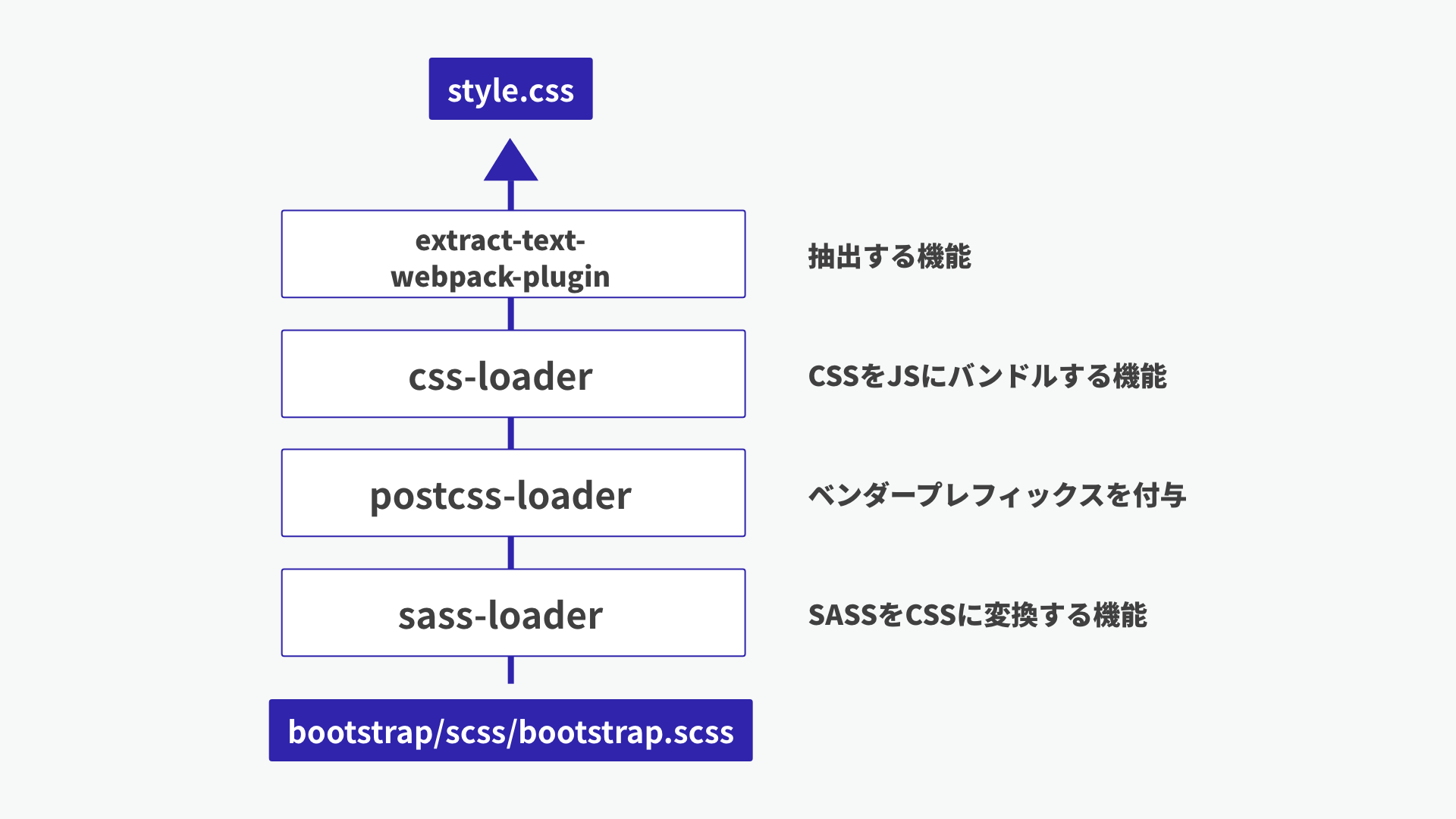 なお、~bootstrapという記述はwebpackの記法です。scssファイルでnode_modulesフォルダーを参照できます。