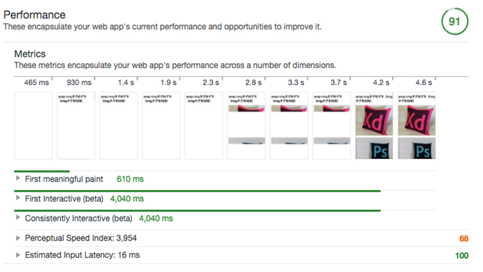 「First Meaningful Paint」がページの主要なコンテンツがスクリーンに表示されるまでの時間、「First Interactive」がページが最低限の操作を受け付けるようになるまでの時間、「Consistently Interactive」がページが完全に操作を受け付けるようになるまでの時間になります。