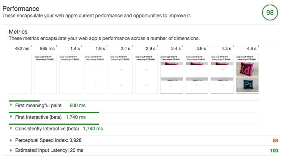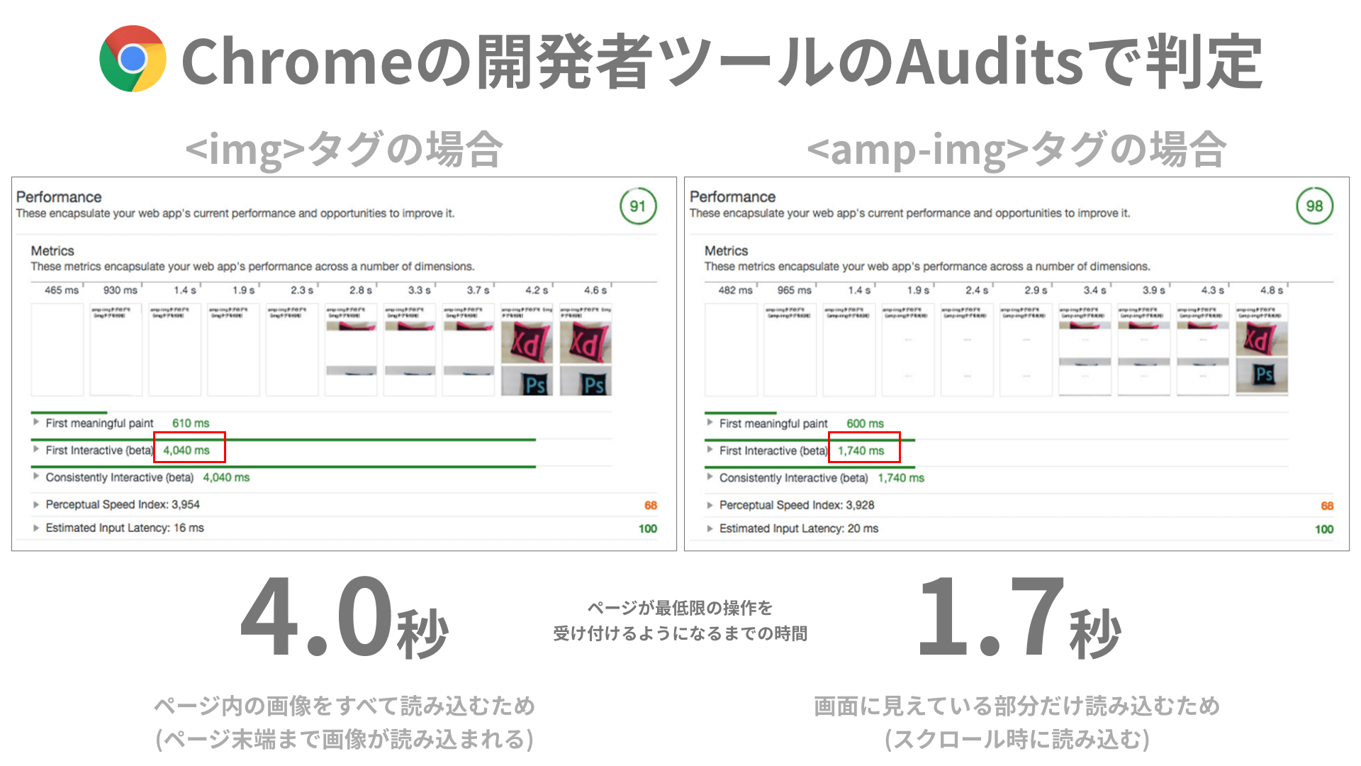 計測結果を比較すると「主要コンテンツが表示され始める時間」はさほど変わりませんが、「ユーザー操作を受けるけるようになるまでの時間」がimgタグの場合は4,040ミリ秒かかっていますが、amp-imgタグを利用して遅延ロードを行うことで1,740ミリ秒に短縮されており、約60%の高速化となっています。