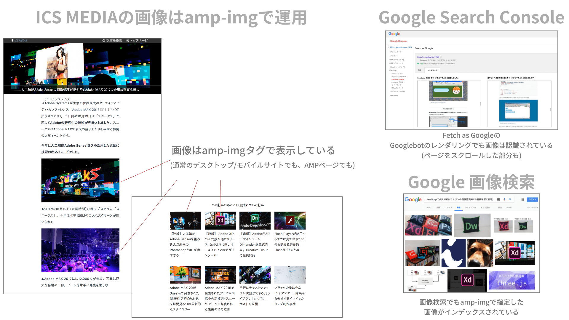 AMP JSはPCページ・モバイルページ(非AMPページ)でも利用でき、その高速化の恩恵を受けることができます。今、皆さんがご覧の本サイト(ICS MEDIA)では非AMPページでAMP JS(amp-imgタグやamp-youtubeタグなど)を導入して1年以上経ちますが、問題なく運用できています。Googleの画像検索にもインデックスされています。