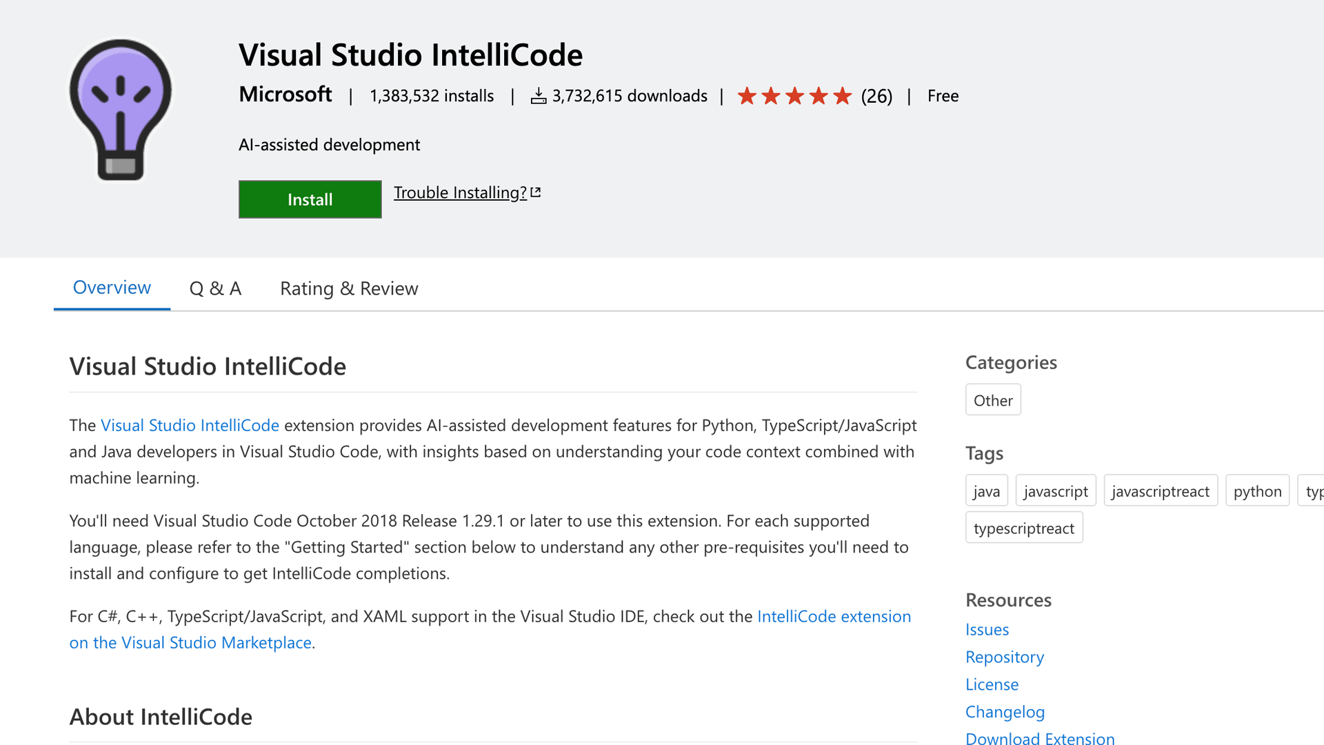 IntelliCodeはMicrosoft謹製の公式プラグイン。AI支援による次世代のコード補完がJavaScriptやTypeScriptで利用できるようになります。APIの一覧がアルファベット順に提示されるのではなく、利用する可能性の高いAPIがAIによって予測されます。