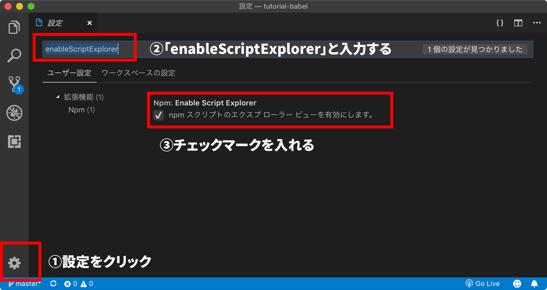 この機能はデフォルトでは有効になっておらずサイドパネルに表示されません。利用するためには設定enableScriptExplorerを変更する必要がります。