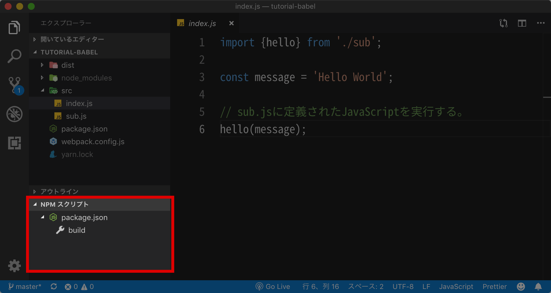 package.jsonファイルに定義したnpm-scriptsはサイドパネルからダブルクリックで実行できます。コマンドプロンプトやターミナルなどの別のソフトウェアを起動することなく実行できるため、とても便利です。ターミナルでいちいちコマンドを打ち込む手間が省けるので、オススメです。