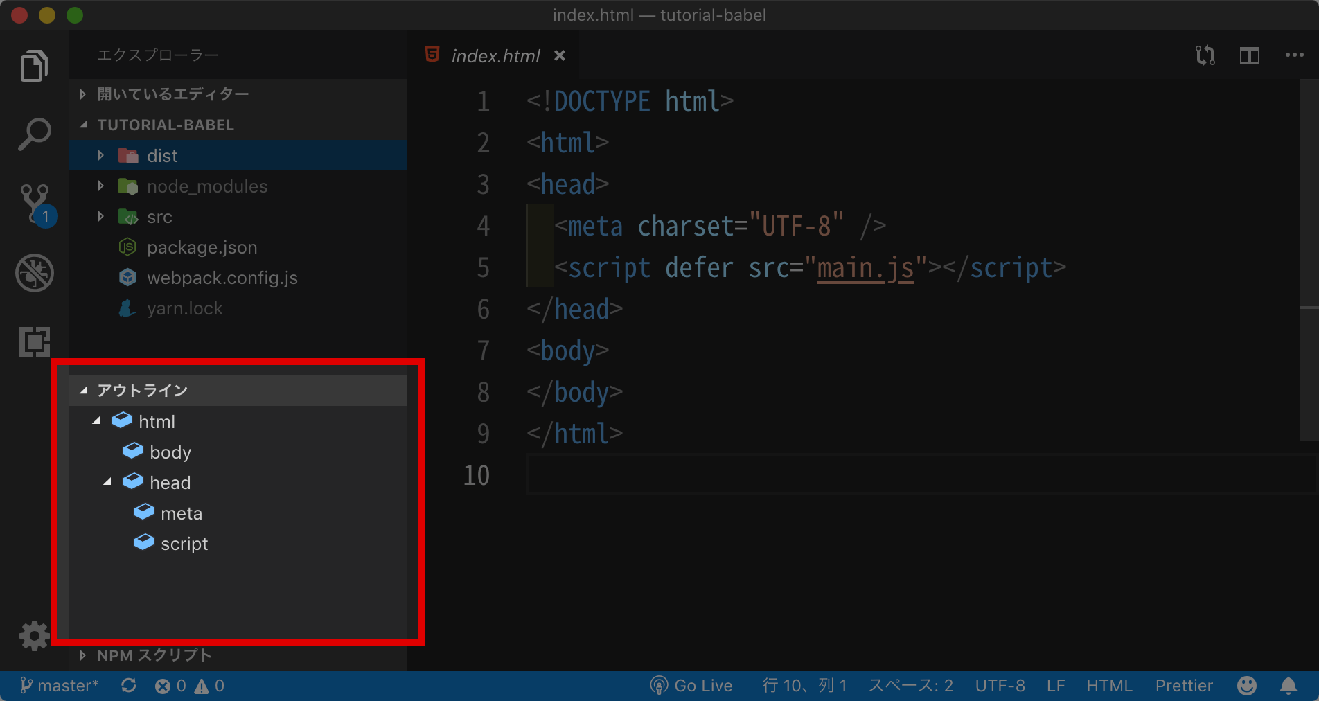 関数名や定数名などの情報をアウトライン表示してくれます。サイドパネルに表示されるアウトラインを選択すると、該当するコードに瞬時に移動できます。さまざまな言語に対応しており、HTML、JavaScript、TypeScriptだけでなく、JSONやYAML、Dockerなどのアウトラインも表示できます。
