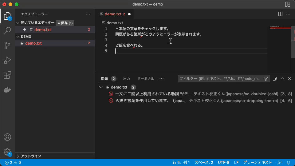 この拡張機能は、VS CodeでテキストファイルやMarkdownファイル等の日本語の文章をチェックします。編集時に自動で校正のチェックを行い、エディター内の該当箇所をマーキングし[問題]パネルに指摘内容を表示します。