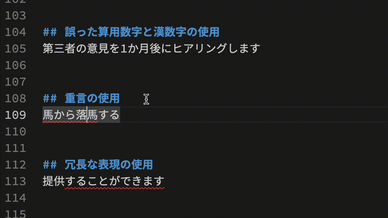 校正のチェックはリアルタイムで行われているため、問題のある箇所を修正すると指摘内容が自動的に消えます。