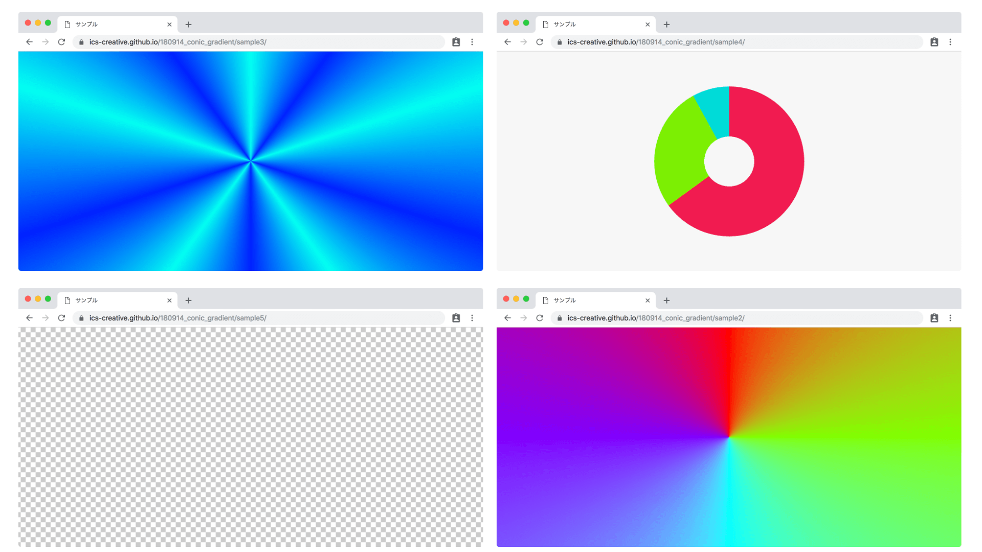 これまでCSSでは直線状グラデーション・放射線状グラデーションが表示可能でしたが、conic-gradient()関数の登場によって円錐状のグラデーションも可能になりました。