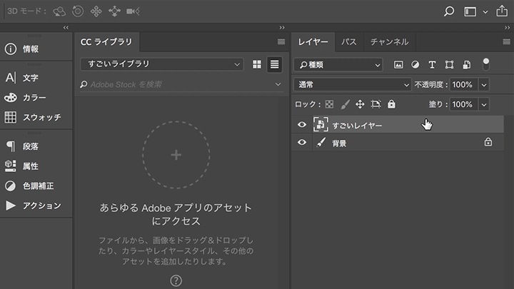 CCライブラリへ保存するには、Photoshopで連携したいレイヤーをスマートオブジェクトに変換し、CCライブラリパネルにドラッグ&ドロップするだけで簡単にできます。