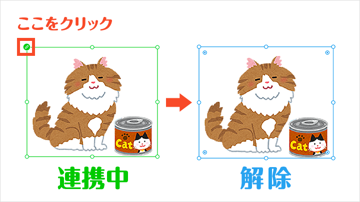 これはTipsですが、オブジェクトを選択すると左上のアイコンが表示されます。これをクリックするとCCライブラリとの連携が解除され、独立したアセットになります。誤ってクリックして連携を解除しないよう注意してください。