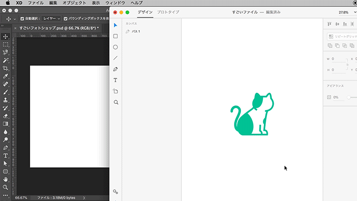 この手順ではSVGとしてペーストされるため、XD上でパスの再編集が可能です。ただし、ドロップシャドウなどのフィルターはコピーされないため、注意してください。